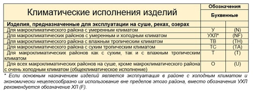 Позначається в описі виробів у вигляді буквено-цифрового коду. Букви вказують на температурний режим/погодні умови, а цифра – на категорію розміщення (де допускається установка). Ви зустрічали такі позначення, як УХЛ1, Т, В та ін. на електротехнічних пристроях, засобах індивідуального захисту і тд.